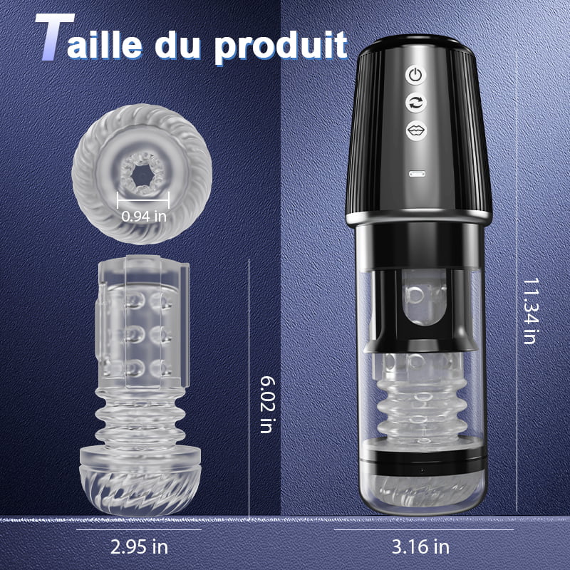 Caractéristiques : 5 rotations 5 succions 7 vibrations, triple moteur, manchon en silicone à texture en 3 sections