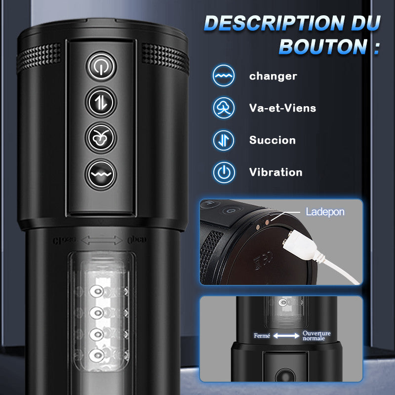 La cup de masturbation télescopique 3 en 1 possède 5 modes d'aspiration et d'étirement et 10 modes de vibration.En s'affaissant fermement et en soulevant la vulve, elle stimule le gland le plus sensible et vous fait éclater au moment de l'orgasme.Elle se caractérise par une vulve douce et réaliste, et sa bouche en TPE simule le processus d'éjection, ce qui vous permet de l'insérer facilement et d'obtenir des orgasmes incroyables. L'intérieur est tapissé de tentacules denses et granuleux qui forment une enveloppe solide, massent votre tige sensible à chaque mouvement et satisfont vos fantasmes à chaque insertion, vous procurant ainsi une sensation de caresse incroyablement réaliste. Des fenêtres transparentes vous permettent de visualiser chaque combat.IPX7 étanche et amovible pour plusieurs cas d'utilisation. Profitez des différentes tensions et succions du vagin d'une femme!Vous l'avez vraiment mérité !